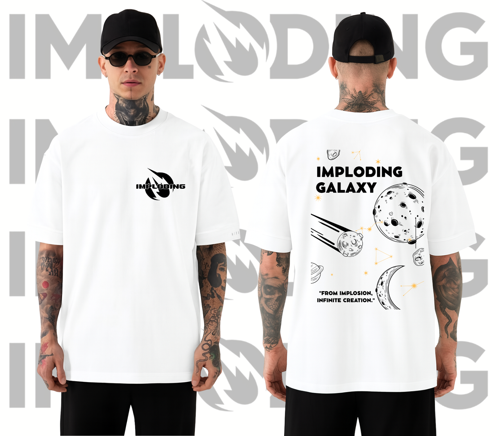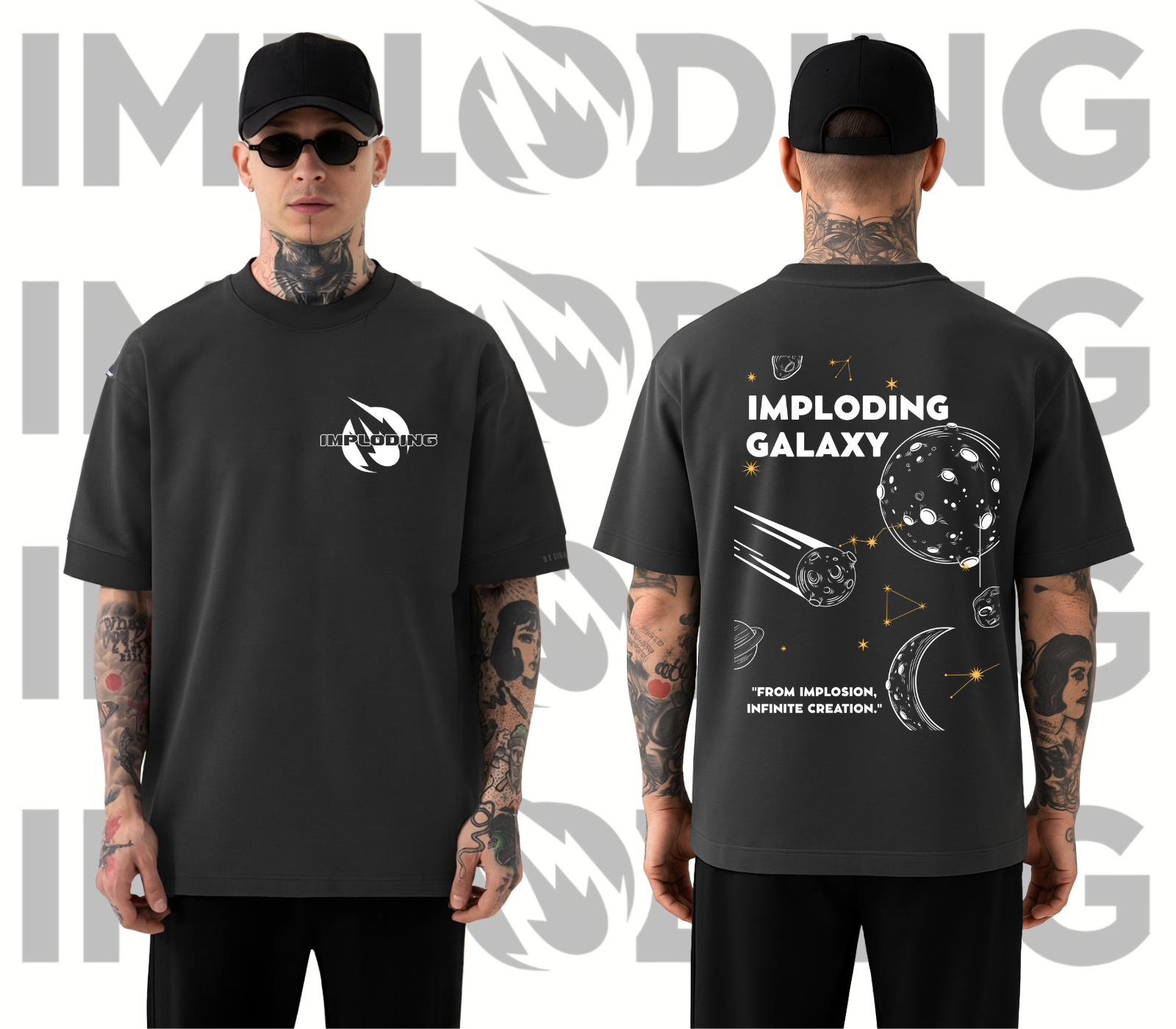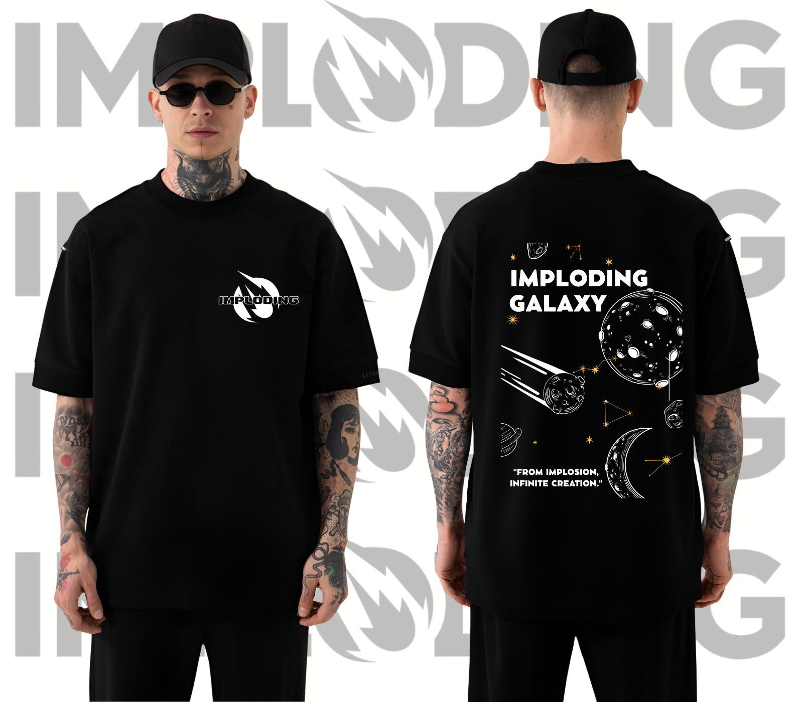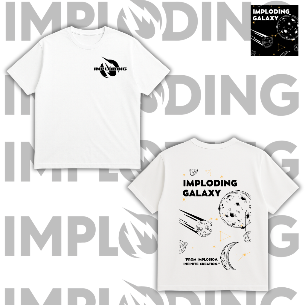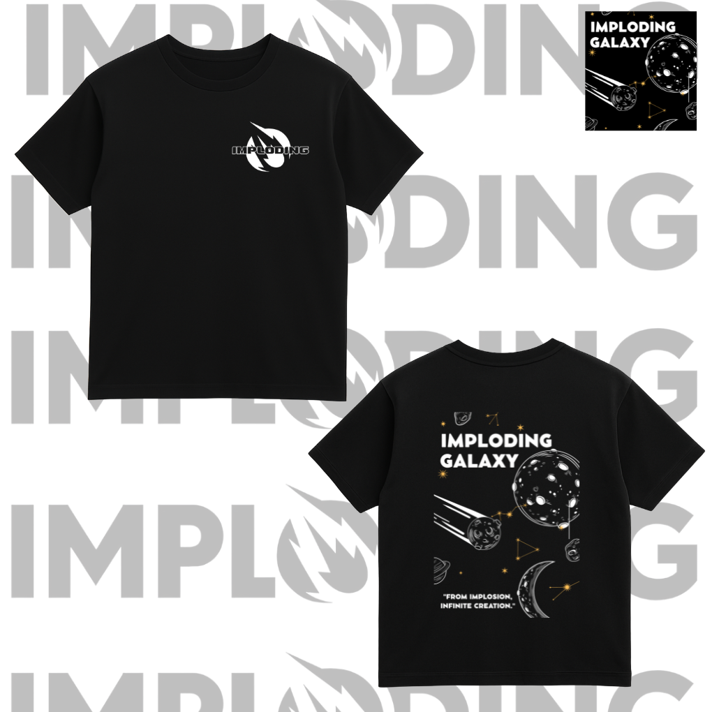 Unleash the universe within you with the Imploding Galaxy Tee! 🚀 This bold black shirt features a minimalist front chest logo and a galaxy-inspired back print filled with planets, constellations, and cosmic energy. Designed with the statement “From Implosion, Infinite Creation”, this tee symbolizes limitless creativity and power.